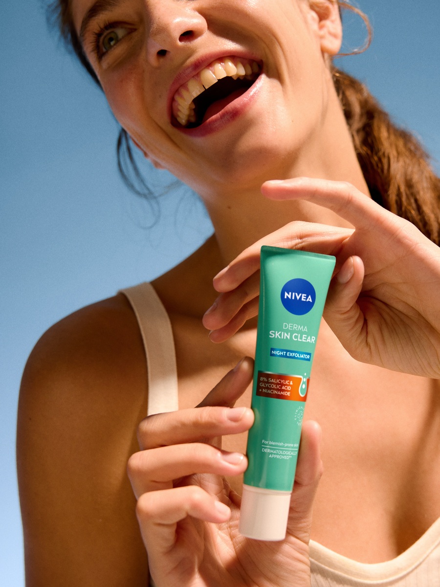 I aftenrutinen kan du overveje en eksfolierende behandling, da den hjælper med at fjerne døde hudceller og forhindre ophobning af snavs, så porerne ikke tilstoppes. NIVEA Derma Skin Clear Chemical Night Exfoliator, som er egnet til daglig brug, støtter hudens naturlige fornyelsesproces med høje koncentrationer af salicylsyre og glykolsyre. Påfør og lad den blive helt absorberet, før du fortsætter med andre plejeprodukter.