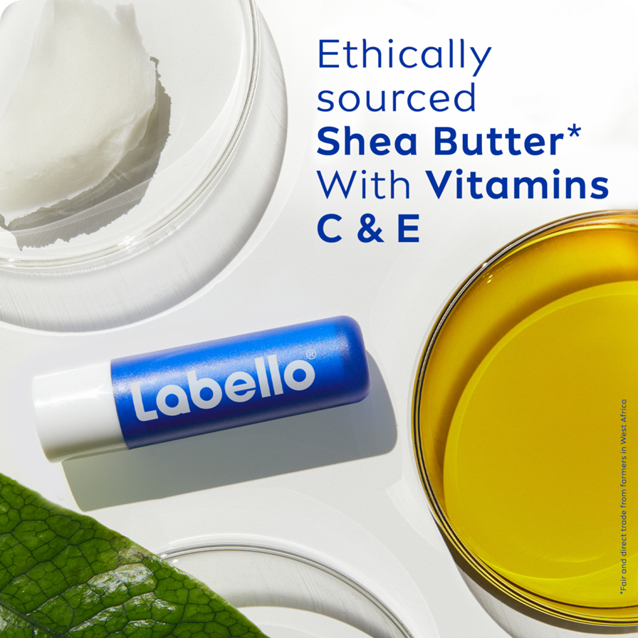 Labello Original Læbepomade fugter dine læber, holder dem bløde og velplejede i over 24 timer. Den forbedrede formel med etisk udvundet sheasmør* og naturlige olier er lavet af 100% naturlige ingredienser og beriget med vitaminer for glatte og velplejede læber.
