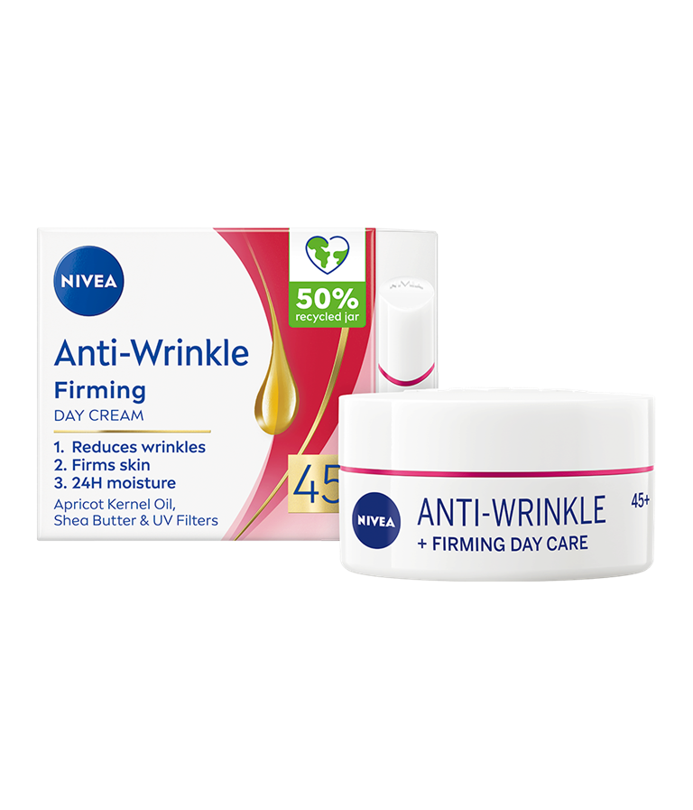 Reducer rynker og opstram huden med NIVEA Anti-Wrinkle + Firming Day Care 45+. Se yngre ud hele dagen! #AntiAging #Hudpleje