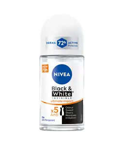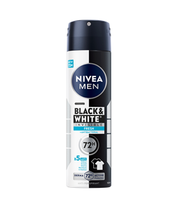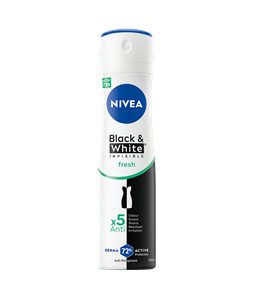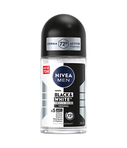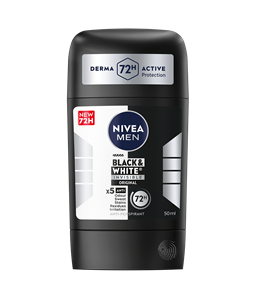 NIVEA Black & White Invisible-serien giver beskyttelse mod hvide mærker på sort tøj og mod gule pletter på hvidt tøj takket være den unikke patenterede anti-plet-teknologi. Det er en pålidelig 72 timers anti-perspirant beskyttelse, stærk mod sved og lugt, som plejer din hud.