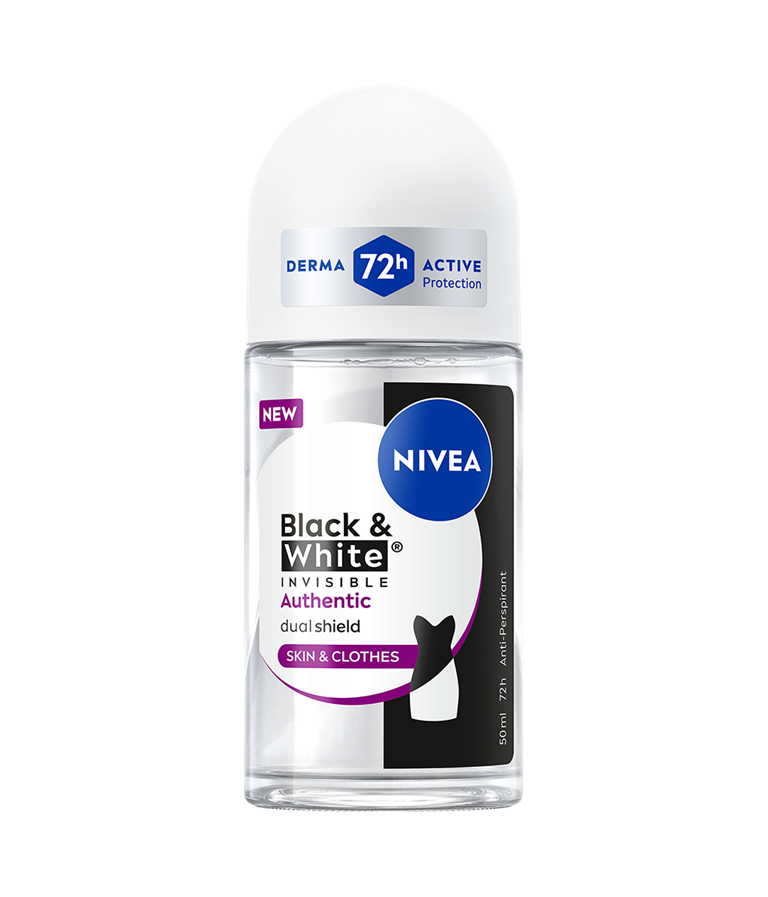 NIVEA Black & White Invisible med Dual Shield-teknologi beskytter mod hvide mærker på sort tøj og gule pletter på hvidt tøj. Pålidelig 72-timers antiperspirant mod sved og lugt – beskytter både hud og tøj.