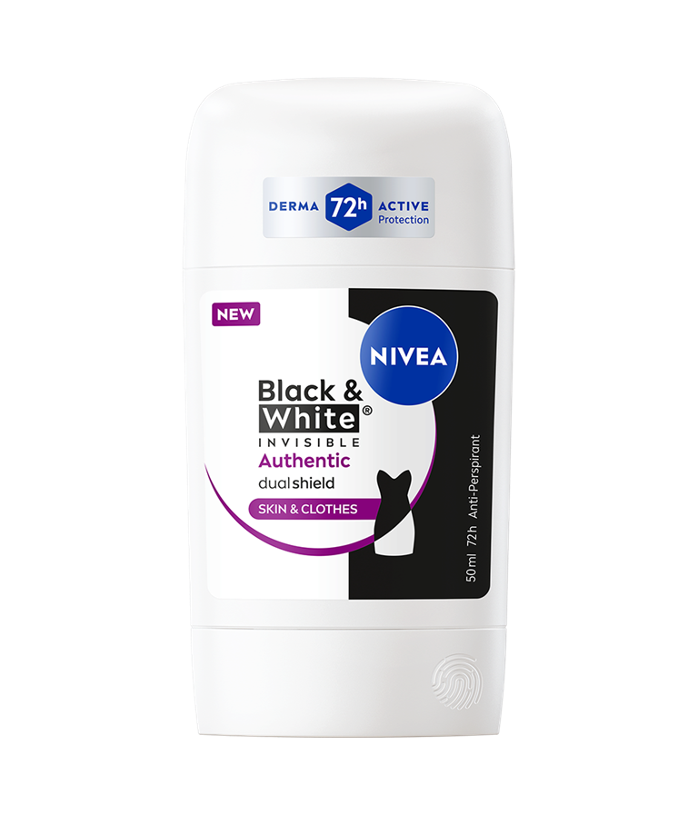 NIVEA Black & White Invisible med Dual Shield-teknologi giver beskyttelse mod hvide mærker på sort tøj og mod gulfarvning på hvidt tøj. En pålidelig antiperspirant med 72 timers beskyttelse mod sved og lugt, der beskytter både hud og tøj.