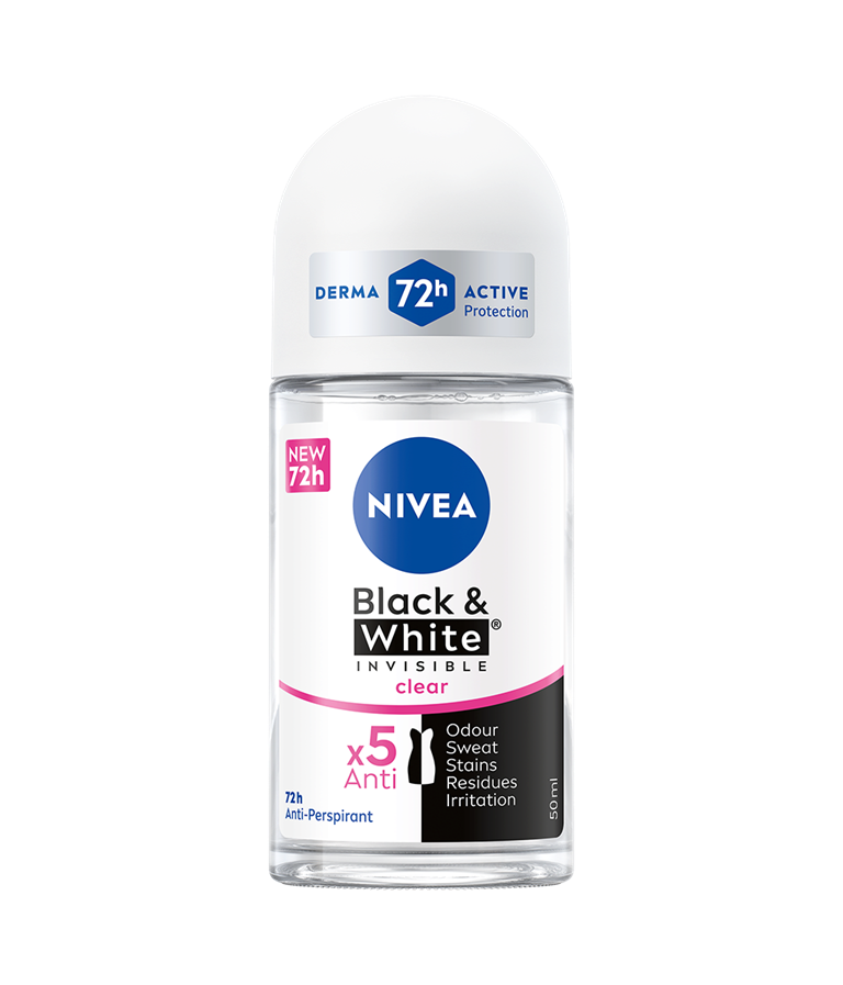 NIVEA Black & White Invisible-serien giver beskyttelse mod hvide mærker på sort tøj og mod gule pletter på hvidt tøj takket være den unikke patenterede anti-plet-teknologi. Det er en pålidelig 72 timers anti-perspirant beskyttelse, stærk mod sved og lugt, som plejer din hud.
