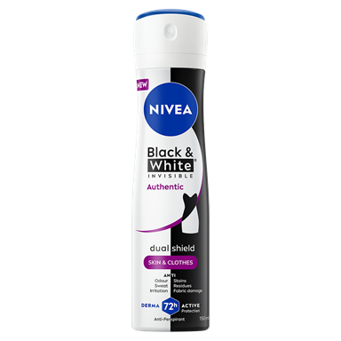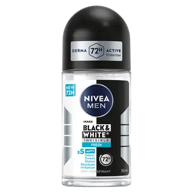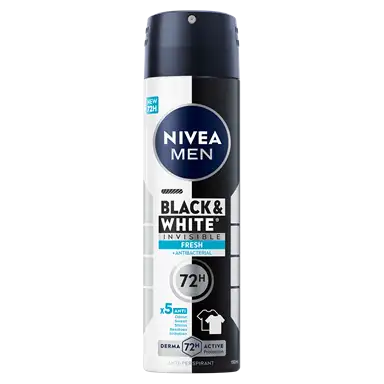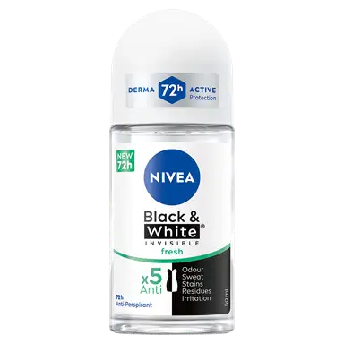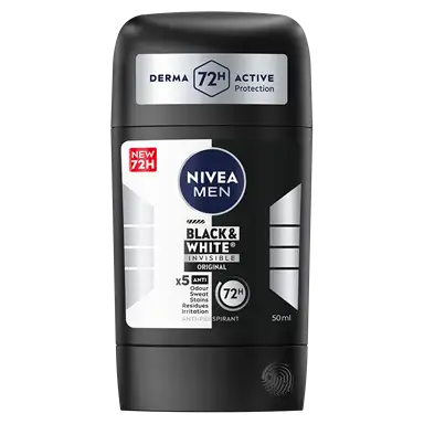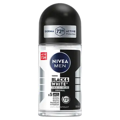 NIVEA Black & White Invisible-serien giver beskyttelse mod hvide mærker på sort tøj og mod gule pletter på hvidt tøj takket være den unikke patenterede anti-plet-teknologi. Det er en pålidelig 72 timers anti-perspirant beskyttelse, stærk mod sved og lugt, som plejer din hud.