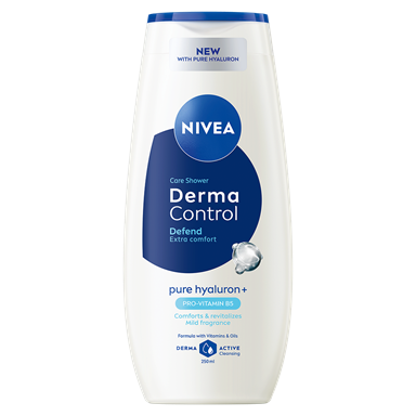 NIVEA Derma Control Restore Shower med Pure Hyaluron og Pro-Vitamin B5 - en plejende shower gel til følsom hud med allergivenlig duft. Formlen renser skånsomt huden, samtidig med at den understøtter dens modstandskraft mod irritation og udtørring. For øjeblikkelig blød, glat og sund hudfornemmelse.