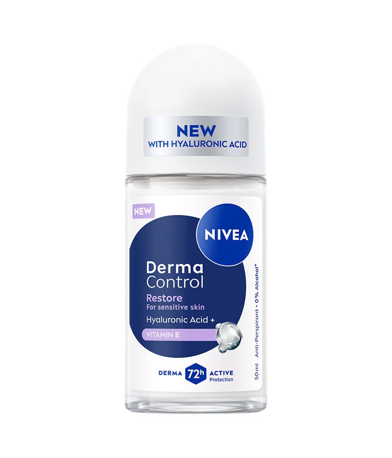 NIVEA Derma Control Restore-serien med ren hyaluron og E-vitamin beroliger irriteret hud efter barbering. Antiperspiranterne giver 72 timers sved- og lugtbeskyttelse, mens de efterlader dine armhuler blødere og smukkere med en sund hudfølelse. Til følsom hud med allergivenlig duft.
