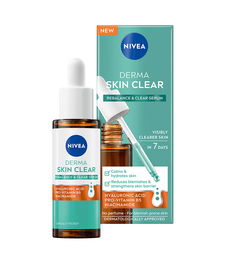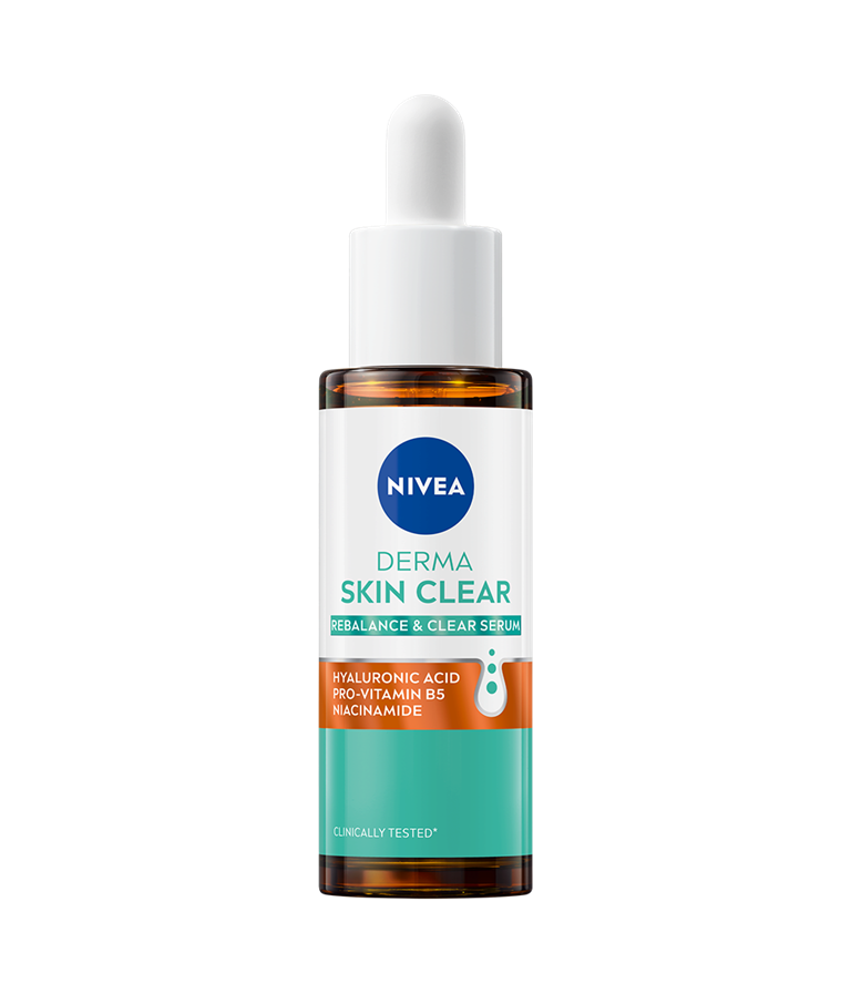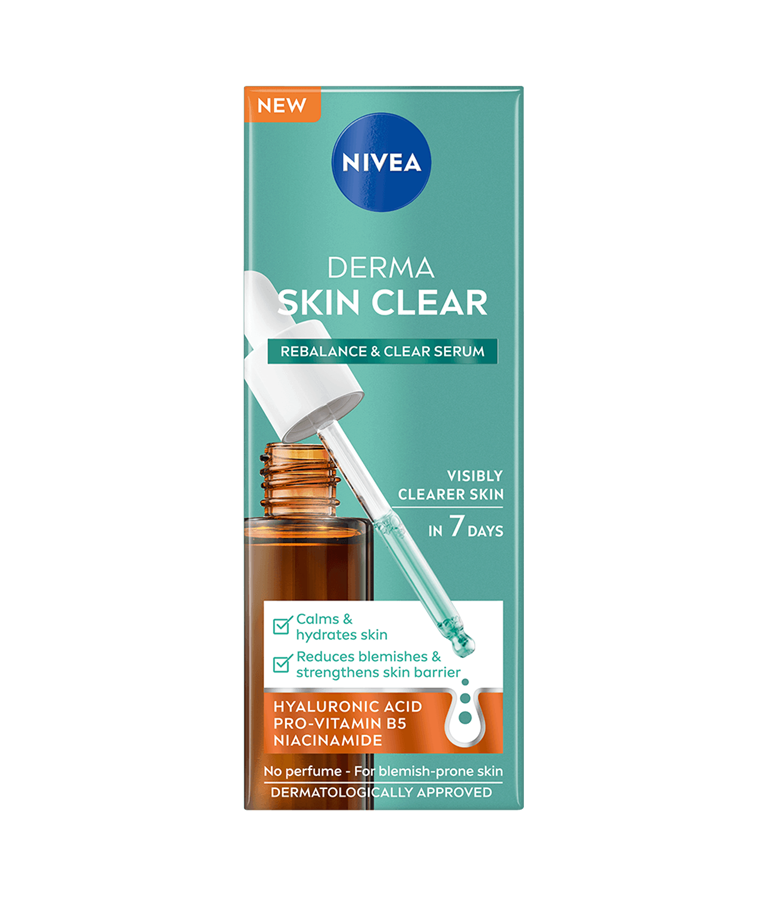 Forbedr din anti-blemish-rutine med NIVEA Derma Skin Clear Rebalance & Clear Serum, der er formuleret til at berolige og fugte huden, styrke hudbarrieren og reducere urenheder.