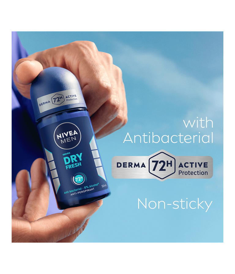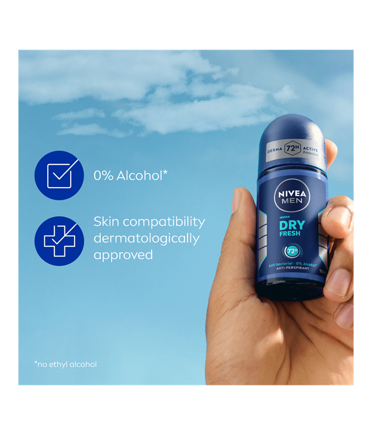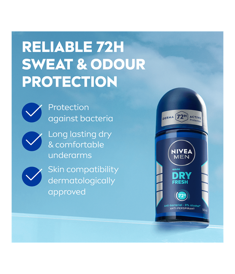 NIVEA MEN Dry Fresh Antiperspirant med Dual Protect-formel med to antibakterielle aktive ingredienser sikrer komfort og tørhed. Pålidelig 72 timers antiperspirantbeskyttelse, der plejer huden.