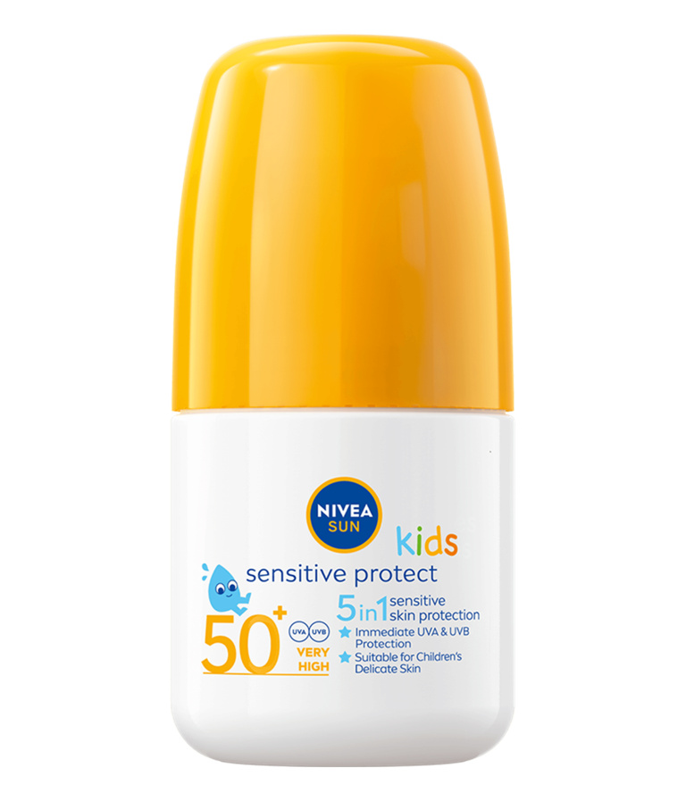5-i-1 solbeskyttelse til babyers og børns sensitive hud. Ekstra vandresistent, med øjeblikkelig beskyttelse mod UVA/UVB-stråler. NIVEA SUN Babies & Kids Sensitive Protect Roll-on.