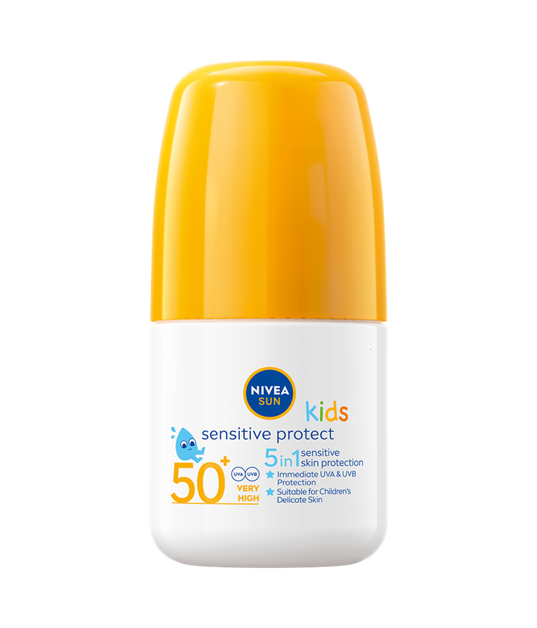 5i1 solbeskyttelse til babyer og børns følsomme hud. Ekstra vandafvisende, øjeblikkelig beskyttelse mod UVA/UVB-stråler. NIVEA SUN Babies & Kids Sensitive Protect Roll-on.