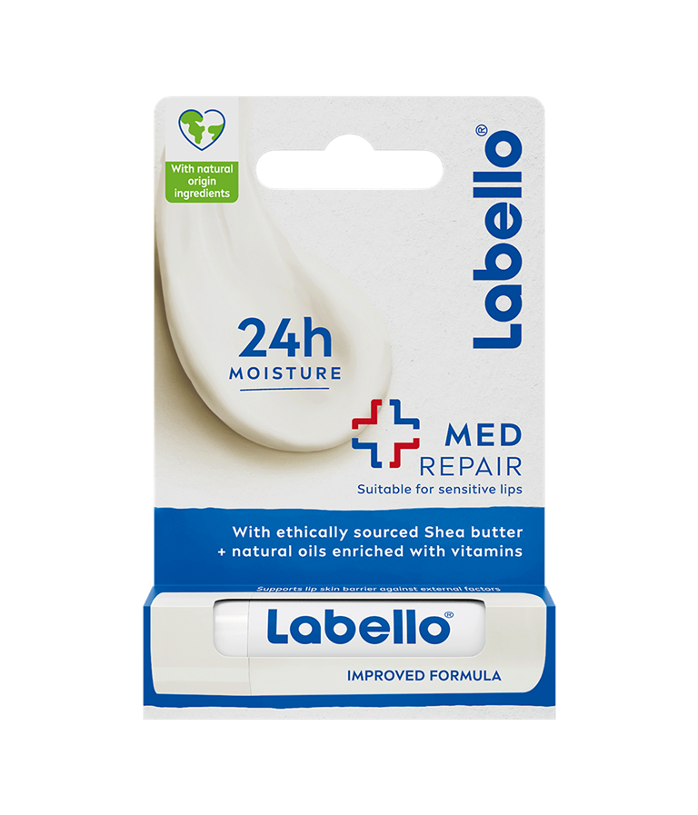 Labello 24h Moisture MED Repair Læbepomade giver øjeblikkelig lindring til tørre og sprukne læber og holder dine læber fugtede i 24 timer - klinisk testet.