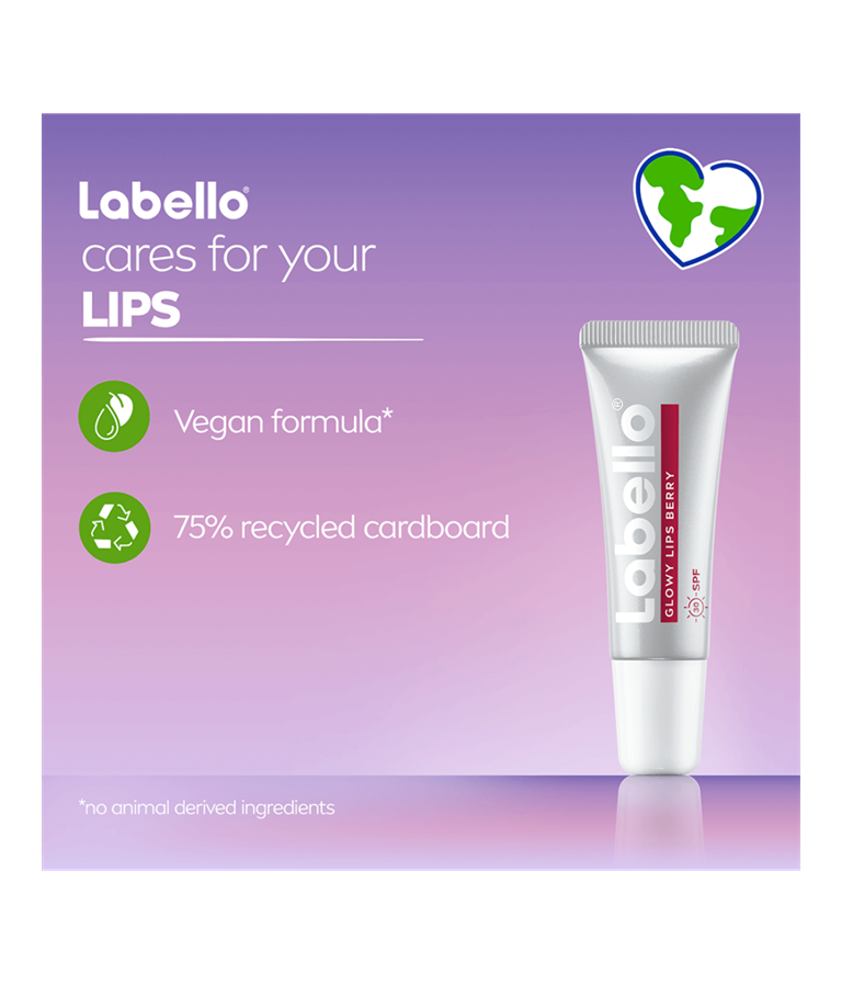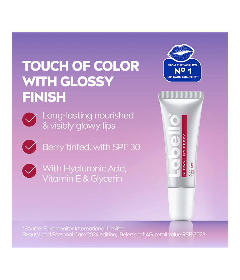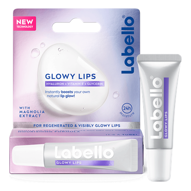 Labello® GLOWY LIPS med et strejf af farve og en fyldig glansfuld finish. For langvarige og synligt glødende læber.