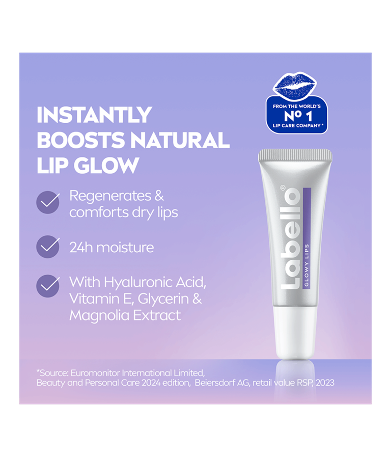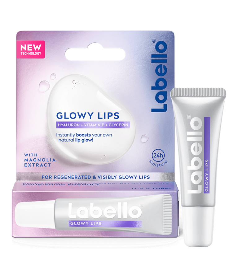 Labello® GLOWY LIPS booster øjeblikkeligt din egen naturlige læbeglød. For friske og synligt glansfulde læber med 24 timers fugt.