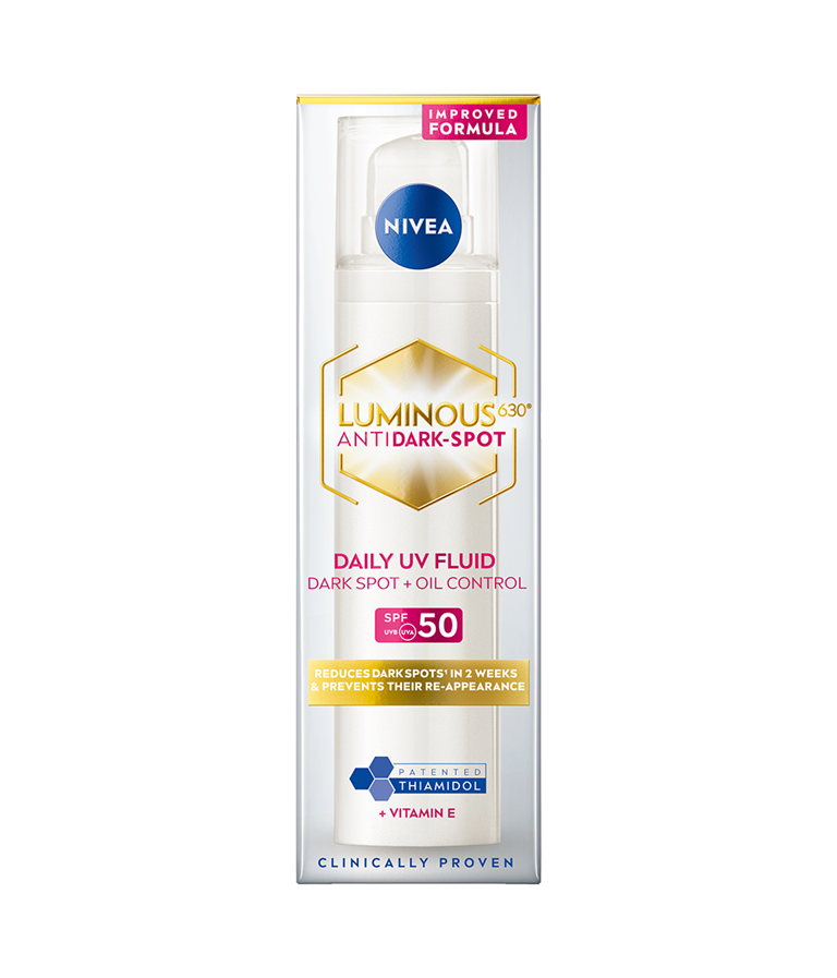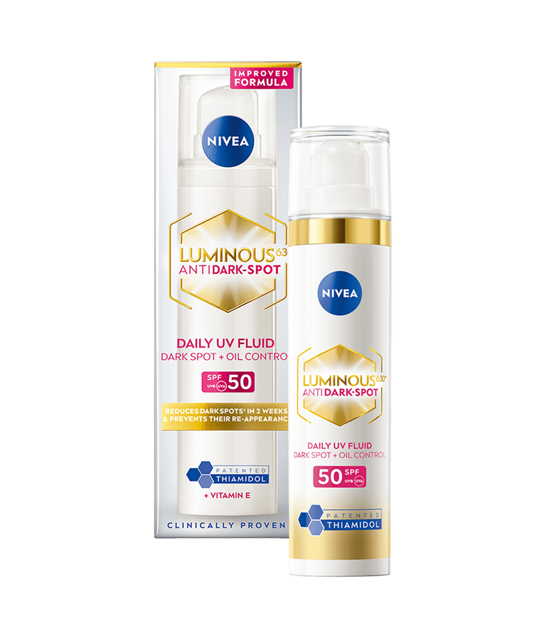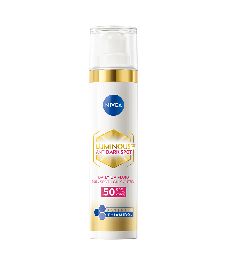 LUMINOUS630® ANTISPOT Daily UV Fluid SPF50 med patenteret Thiamidol® reducerer mørke pletter synligt efter 2 uger.