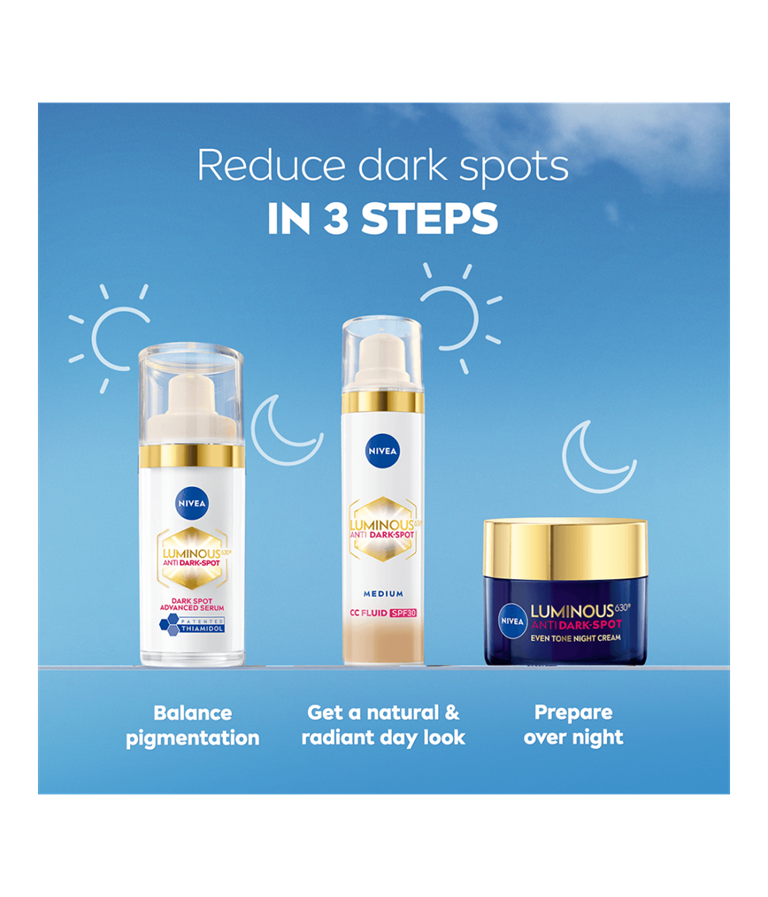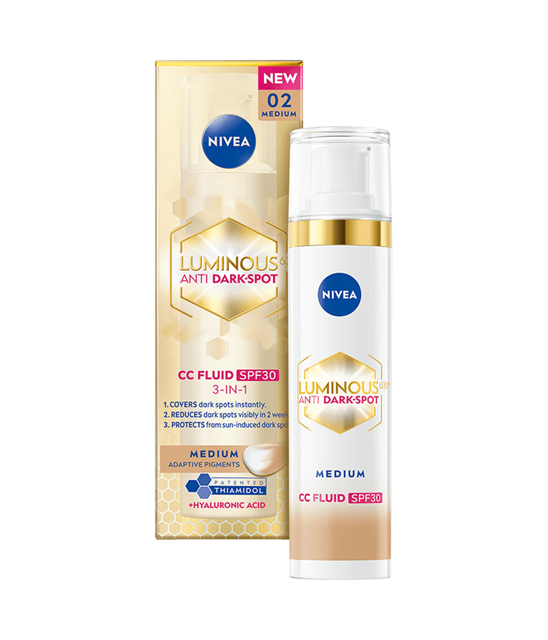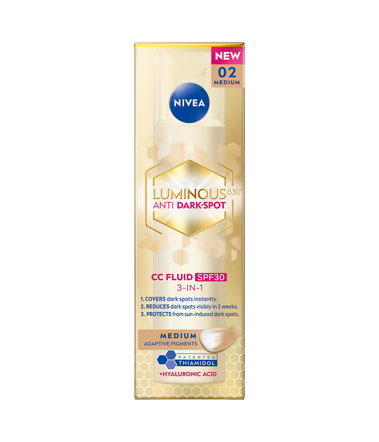 Luminous630 CC Fluid dækker, reducerer og beskytter mod pigmentpletter - synlige resultater på 2 uger. Med pigmenter, der tilpasser sig hudtonen. For en ensartet, lysere og mere strålende hud.