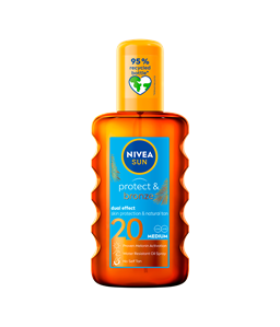 Solbeskyttelse for en smuk og jævn kulør. Dobbelt effekt: hudbeskyttelse og naturlig kulør med dokumenteret melaninaktivering. NIVEA SUN Protect & Bronze Oil Spray.