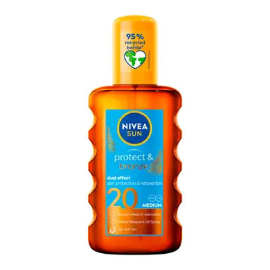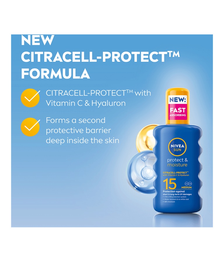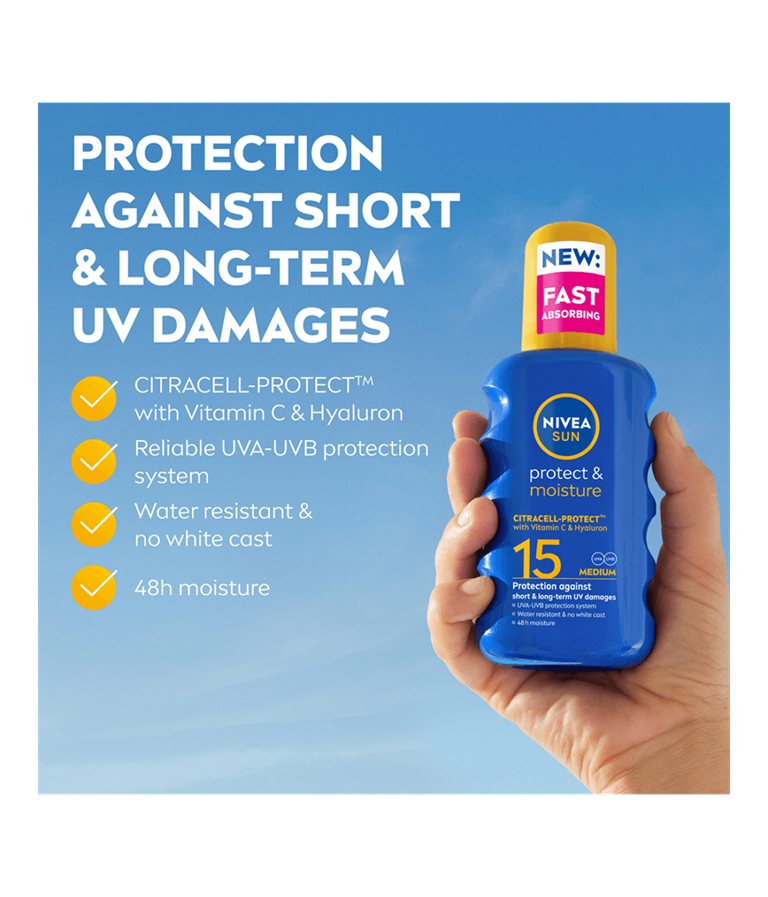 Pålidelig beskyttelse mod UV-skader på kort og lang sigt og 48 timers fugt med den nye, hurtigt absorberende CITRACELL-PROTECT™-formel: NIVEA SUN Protect & Moisture Pump Spray