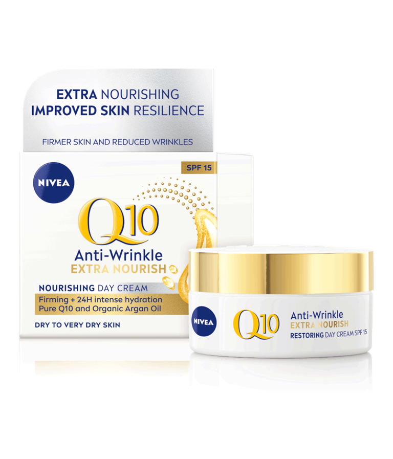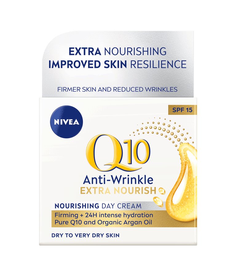 NIVEA Q10 Extra Nourish Day Cream giver beskyttelse mod rynker og er velegnet til tør hud. Dagcremen er beriget med hudidentisk Q10 med dobbelt effekt