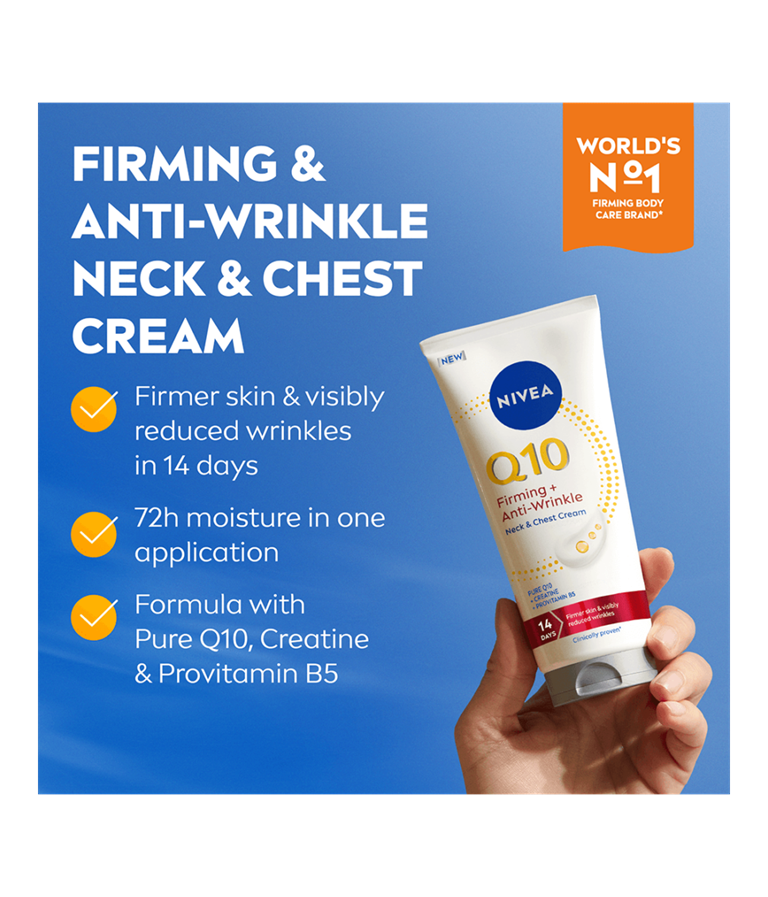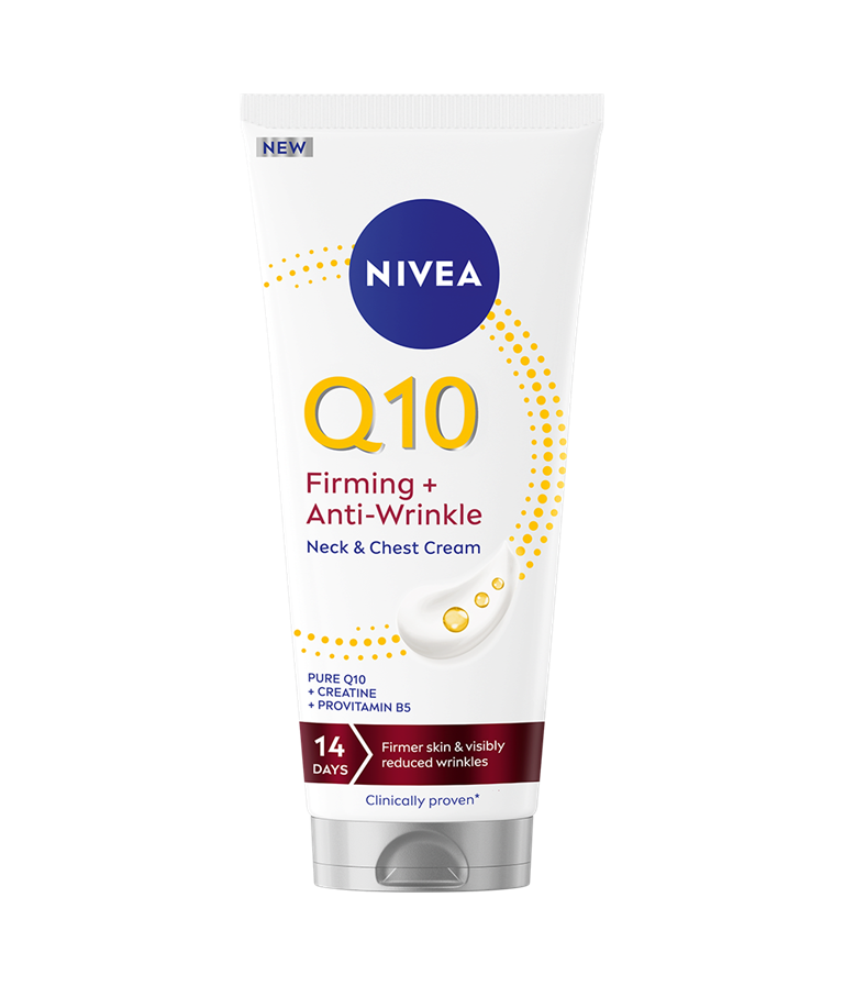NIVEA Q10 Firming+ Anti-wrinkle Neck & Chest Cream er klinisk dokumenteret til at reducere rynker og forbedre hudens elasticitet. Med ren Q10, kreatin og provitamin B5 efterlader den huden fugtet i 72 timer og med en glattere fornemmelse.