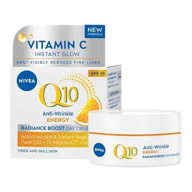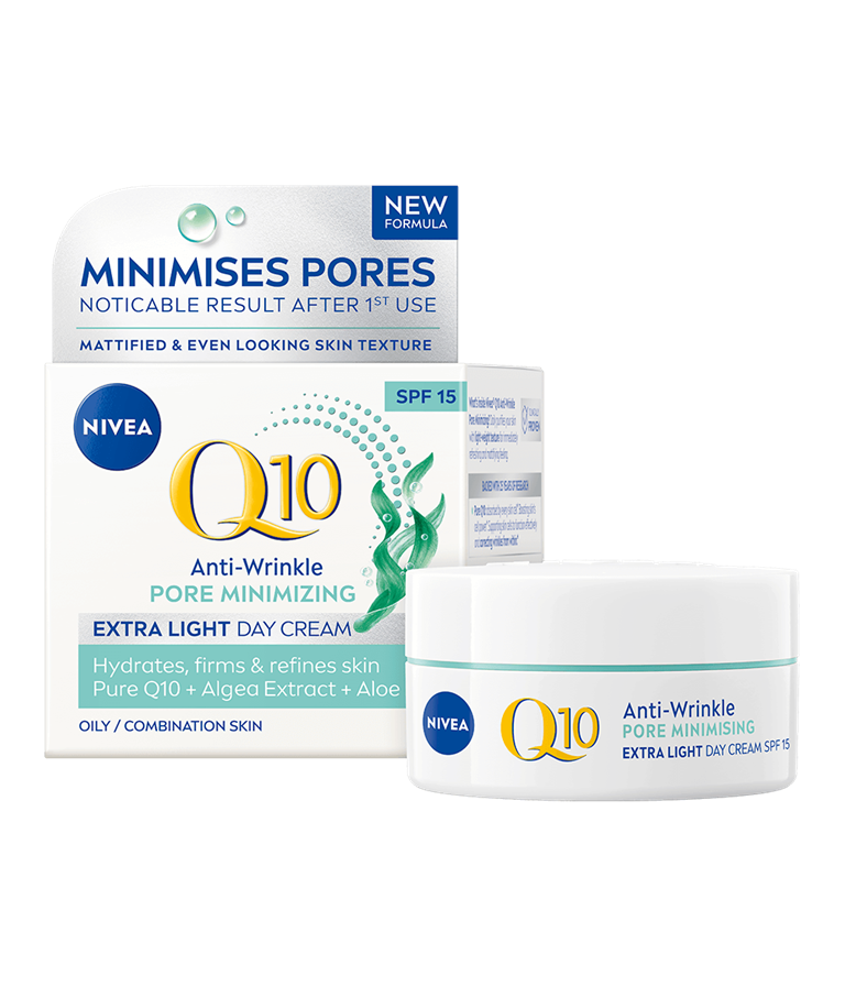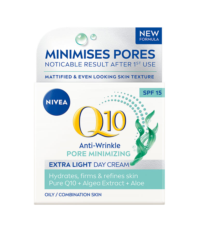 Nivea ® Q10 Anti-Wrinkle Pore Minimizing med let konsistens, der giver en øjeblikkelig forfriskende og matterende følelse.