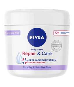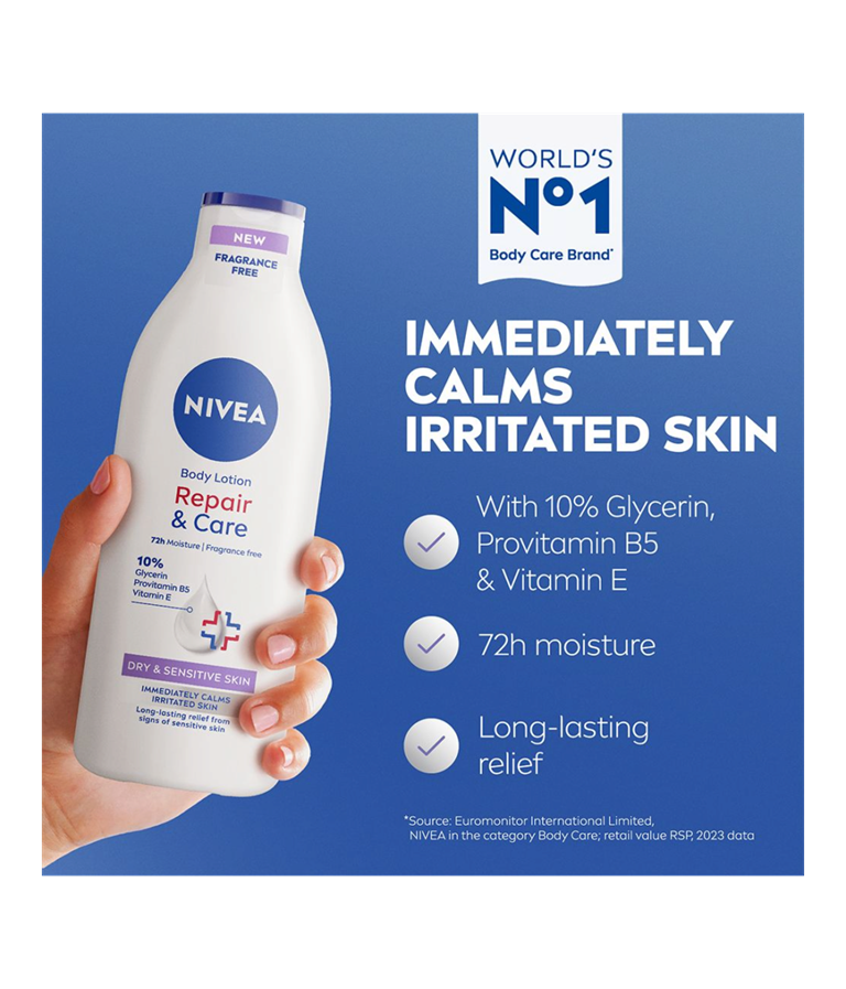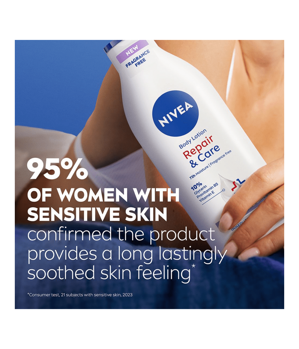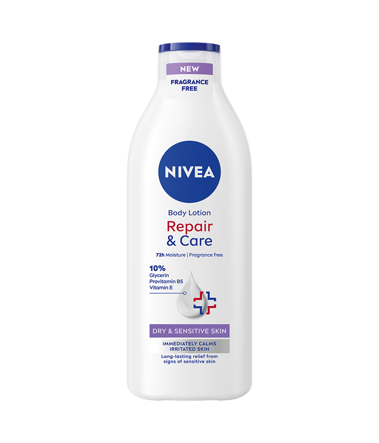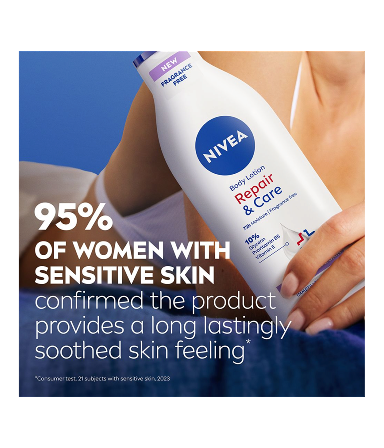 NIVEA Repair & Care Fragrance Free Lotion – din løsning til at berolige sensitiv hud. Den giver 72 timers fugt og har en parfumefri formula, der giver øjeblikkelig lindring. Den beroliger huden og sikrer langvarig komfort. Hudvenligheden er dermatologisk godkendt – perfekt til sart hud.