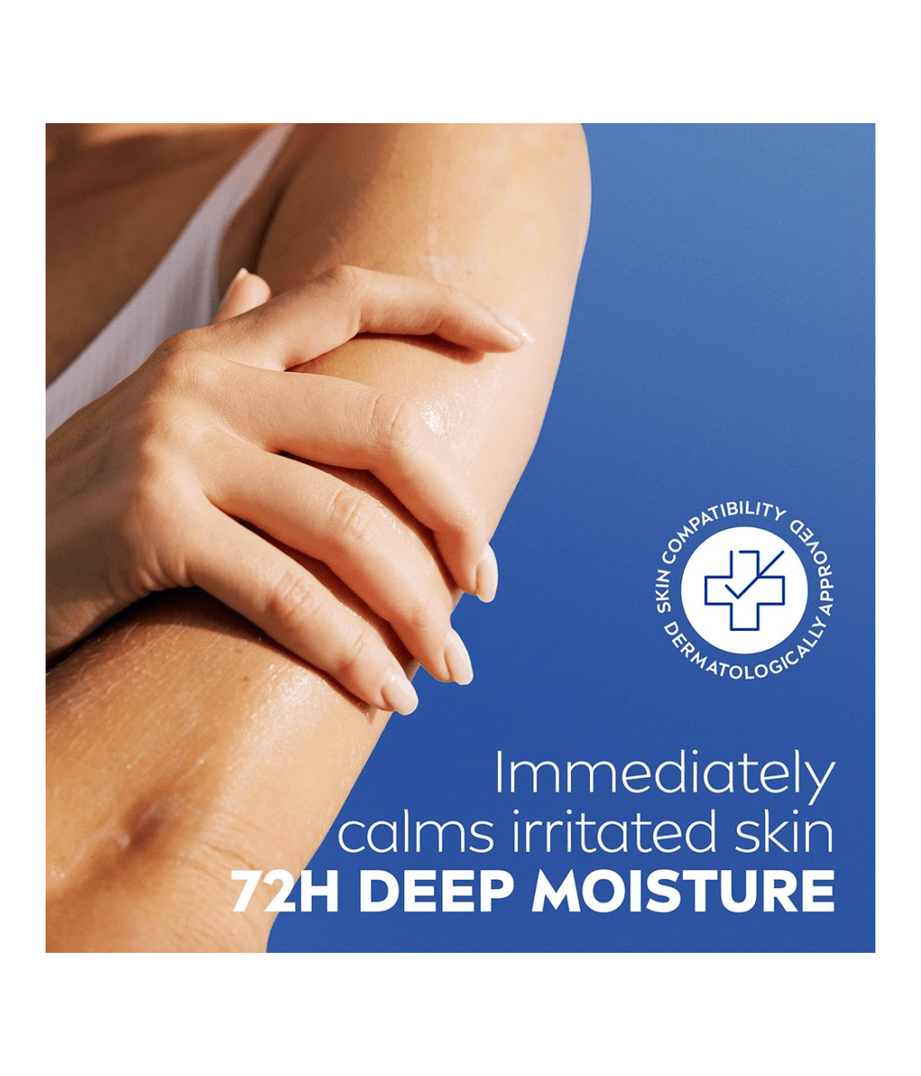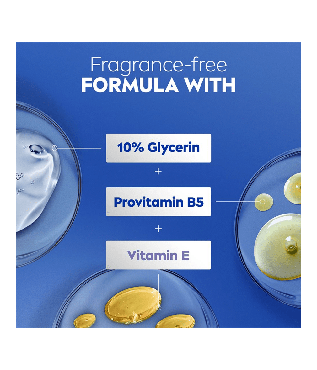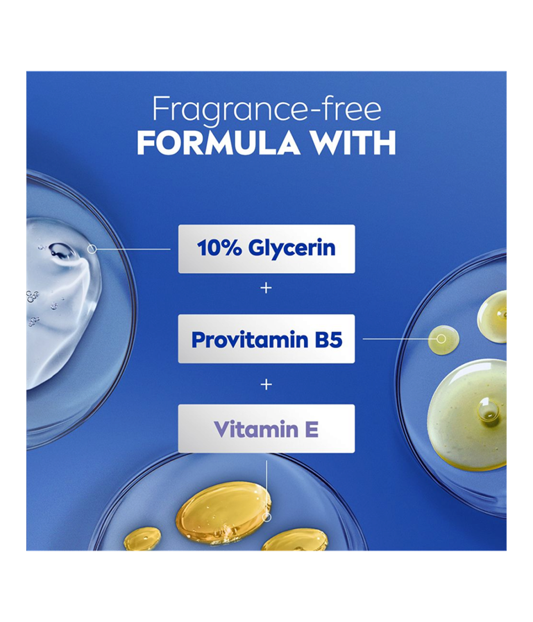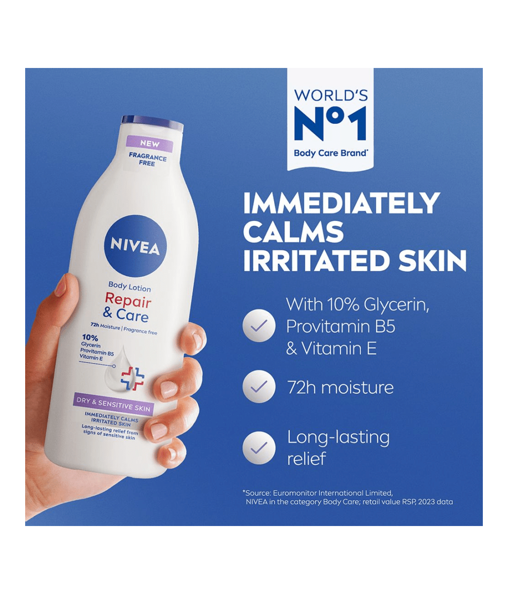 NIVEA Repair & Care Fragrance Free Lotion – din løsning til at berolige sensitiv hud. Den giver 72 timers fugt og har en parfumefri formula, der giver øjeblikkelig lindring. Den beroliger huden og sikrer langvarig komfort. Hudvenligheden er dermatologisk godkendt – perfekt til sart hud.