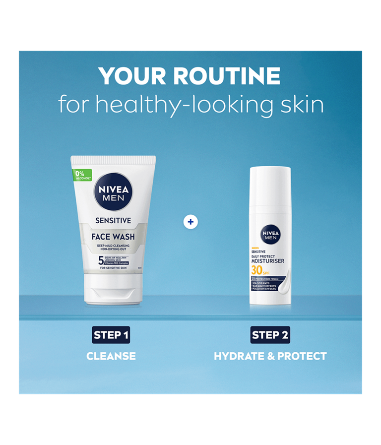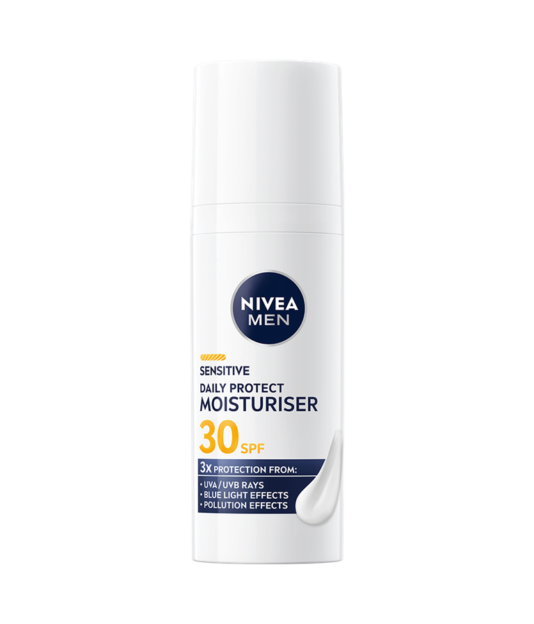 NIVEA MEN Sensitive Daily Protect Moisturiser beskytter følsom hud med SPF30, VitaminPRO Complex og antioxidanter. Den er let, ikke-fedtende og alkoholfri* og giver 3 gange beskyttelse mod UVA/UVB-stråler, blåt lys og forurening for en sund og fugtet hud hele dagen.