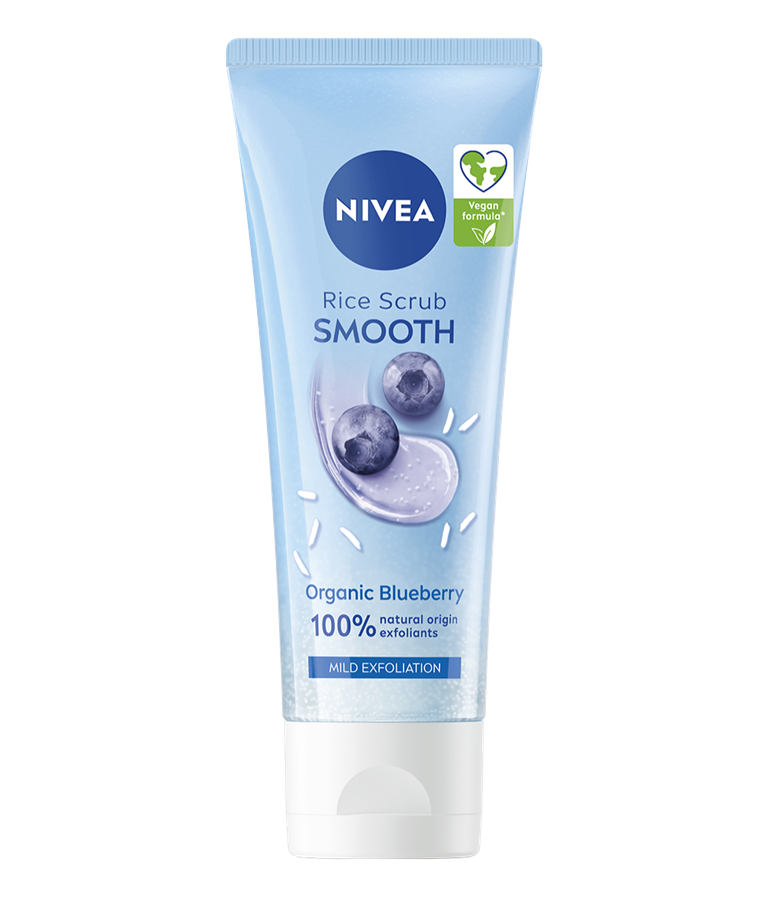 NIVEA Smooth Rice Scrub med økologiske blåbær har eksfolierende korn af 100 % naturlig oprindelse. Japonica-risfrø knuses og sigtes og blandes med saft fra blåbær - alt sammen økologisk.
