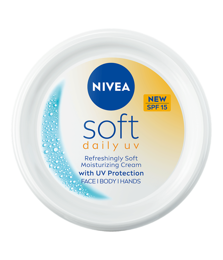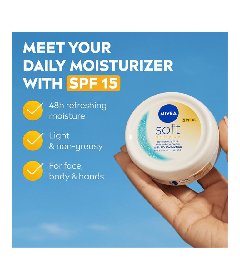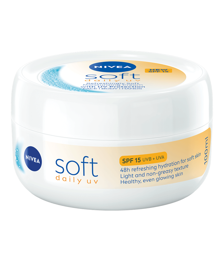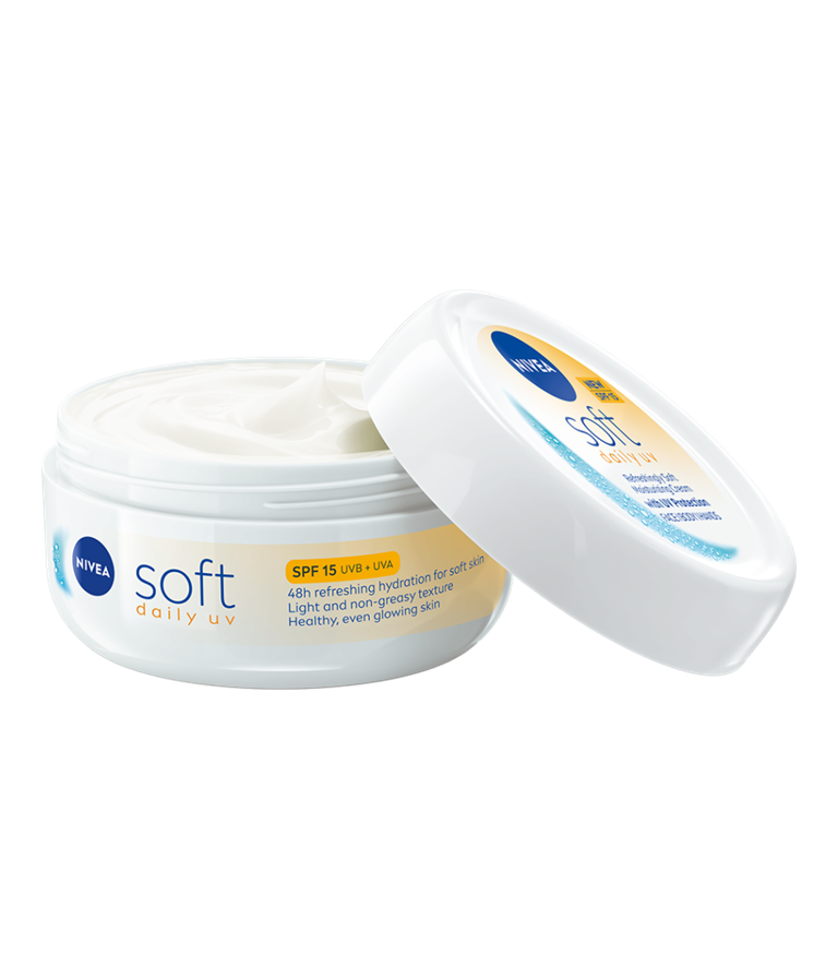 Nyd den forfriskende bløde fugtcreme fra NIVEA Soft Daily UV med SPF 15 UV-beskyttelse for en sund og ensartet glødende hud.