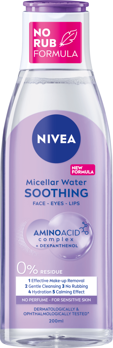 NIVEA Soothing Micellar Water til sensitiv hud fjerner makeup, renser, fugter og beroliger huden uden at efterlade nogen rester. Formlen fjerner effektivt makeup, urenheder og snavs med blot nogle lette strøg, uden at du behøver at gnide.