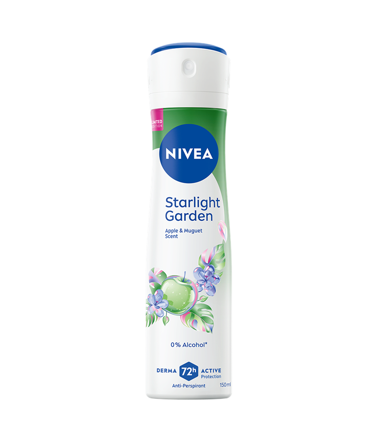 Takket være sine unikke egenskaber kombinerer denne spray 72 timers antiperspirant beskyttelse og aktiv beskyttelse i ét produkt. Nyd af den frugtagtige duft af æble og liljekonval med NIVEA Starlight Garden.