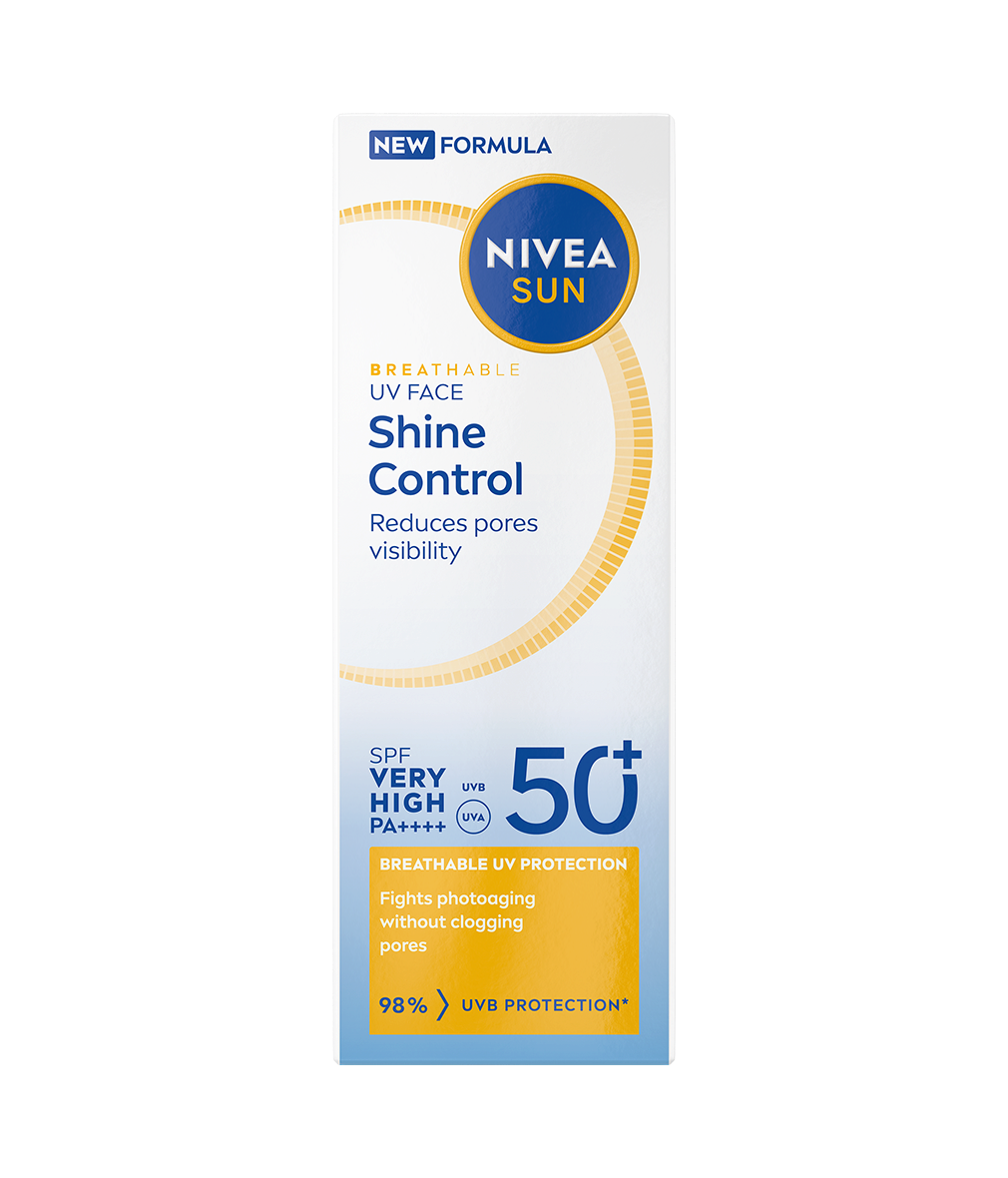 NIVEA UV Face Shine Control SPF 50+ bekæmper fotoaldring uden at tilstoppe porerne. Giver olie-kontrol i 12+ timer og reducerer synligheden af porer.