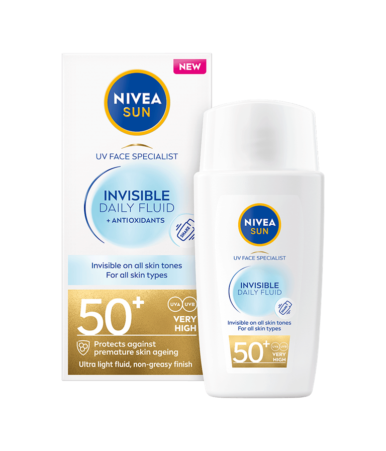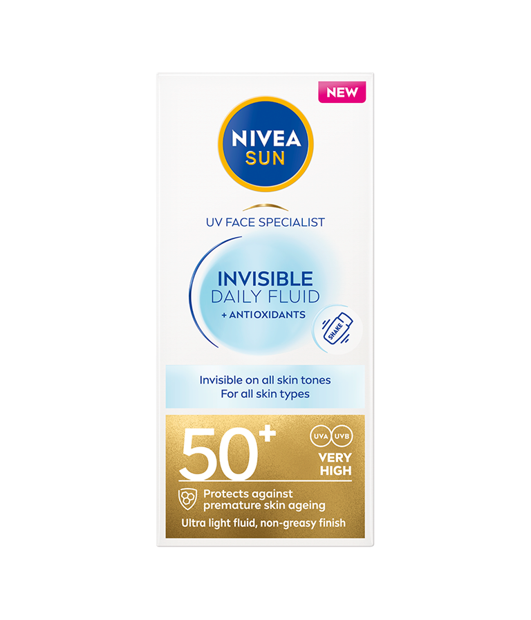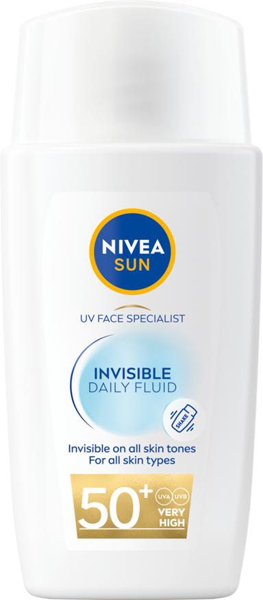 Øjeblikkelig ansigtsbeskyttelse mod UVA/UVB-stråler med usynlig, ultralet formel til alle hudtyper. Ocean Respect-formel. NIVEA SUN UV Face Specialist Invisible Daily Fluid SPF 50+